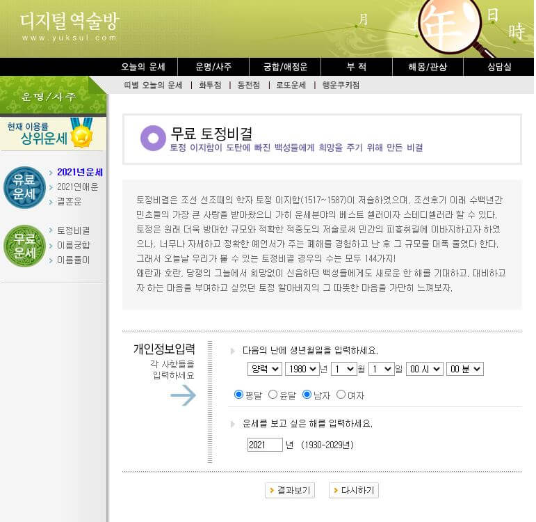 디지털 역술방에서 무료 토정비결을 볼 수 있습니다.